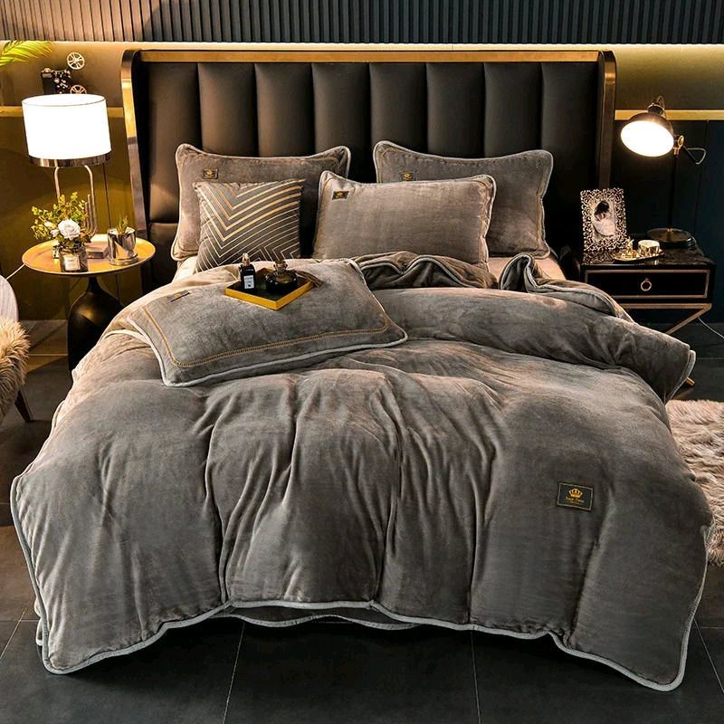 لمسة ملكية لسريرك! طقم 5 قطع (لحاف + 4 خدادية 55*70) ماليزي ناعمة جداً ولمعة تخطف العين، وتقفيل بروفيشنال يجمع بين الرقي والراحة التامة.